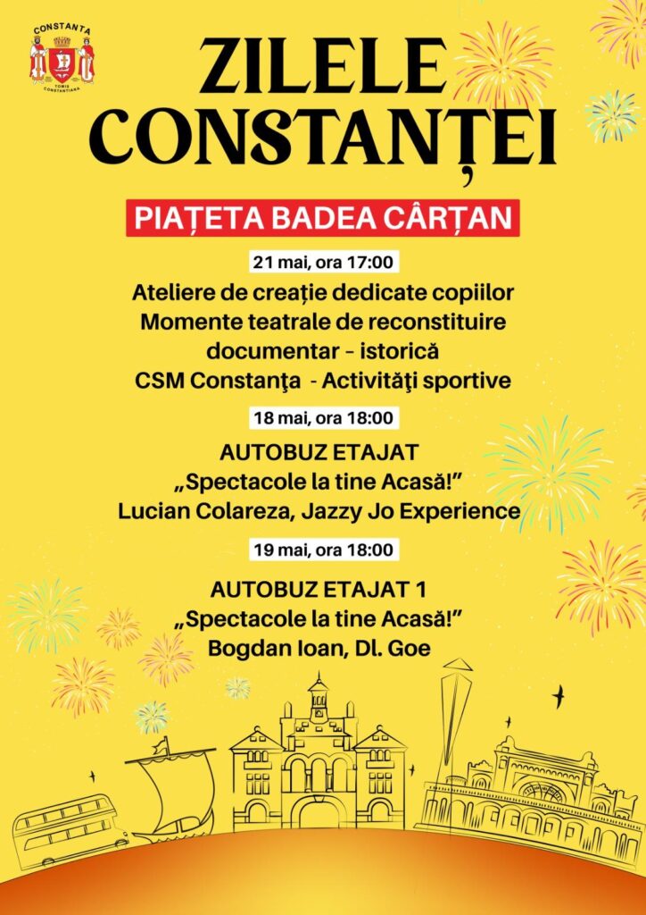 * 17:00 Piațeta Badea Cârțan – ateliere de creație dedicate copiilor + momente teatrale de reconstituire documentar-istorică”, iar CSM Constanța organizează activități sportive