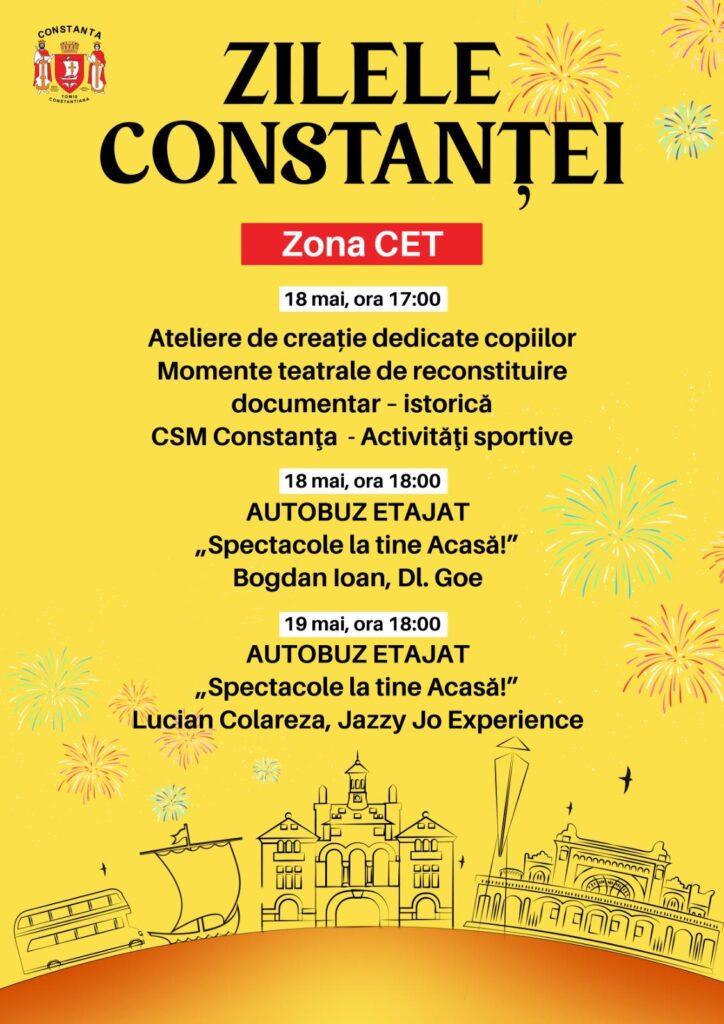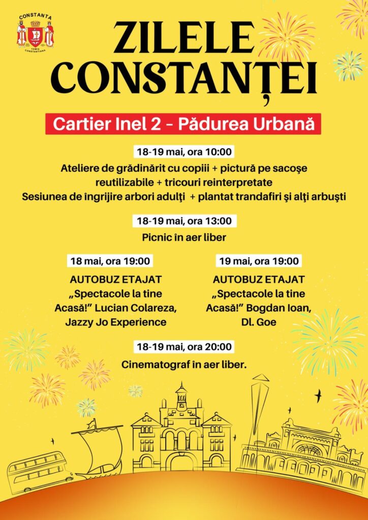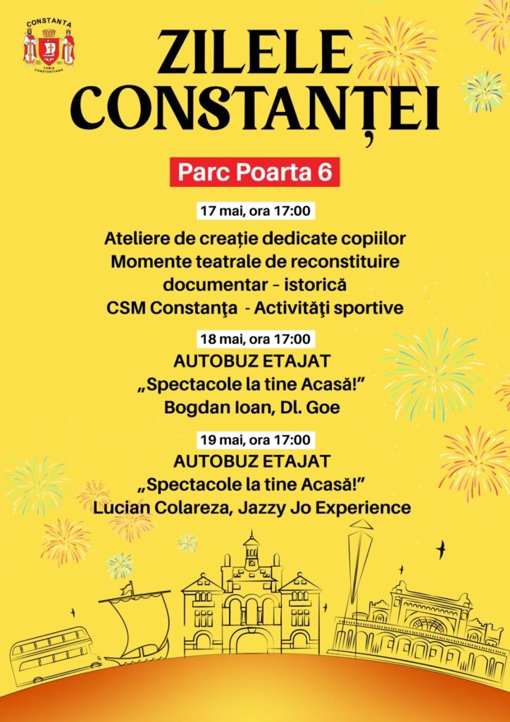 * 17:00 în parc Poarta 6 și parc Dragoslavele, ora 18:00 în zona CET și piațeta Badea Cârțan și de la ora 19:00 în parc Far și cartier inel 2 pădurea urbană autobuzele etajate aduc spectacolul în casele constănțenilor – „Spectacole la tine Acasa!” cu Bogdan Ioan, Dl. Goe, Lucian Colareza și Jazzy Jo Experience