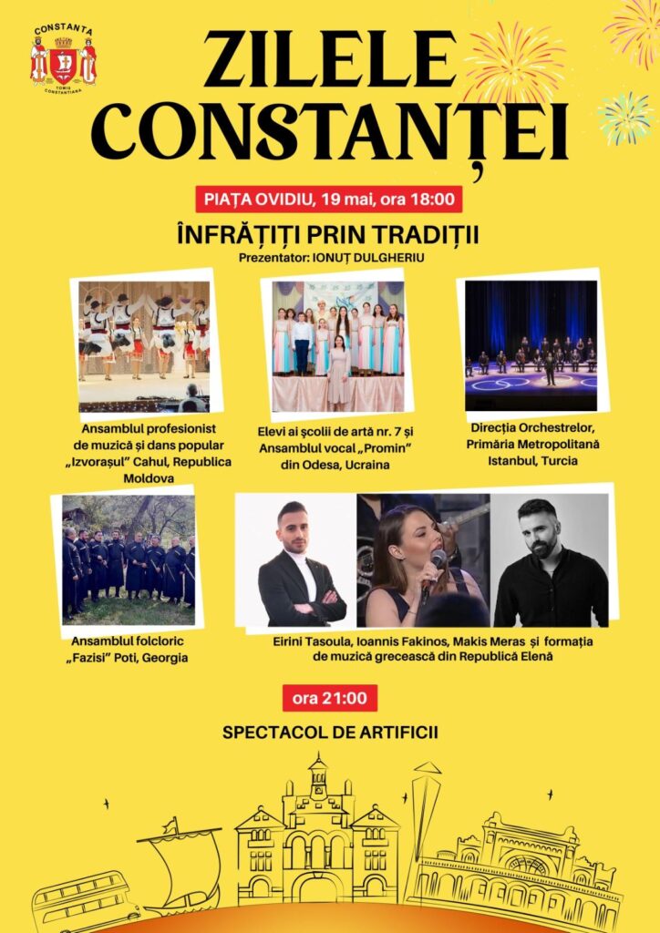 * 18:00 – Piața Ovidiu – Concert vocal – instrumental și coregrafic oferit de elevii Colegiului Național de Arte „Regina Maria” din Constanța